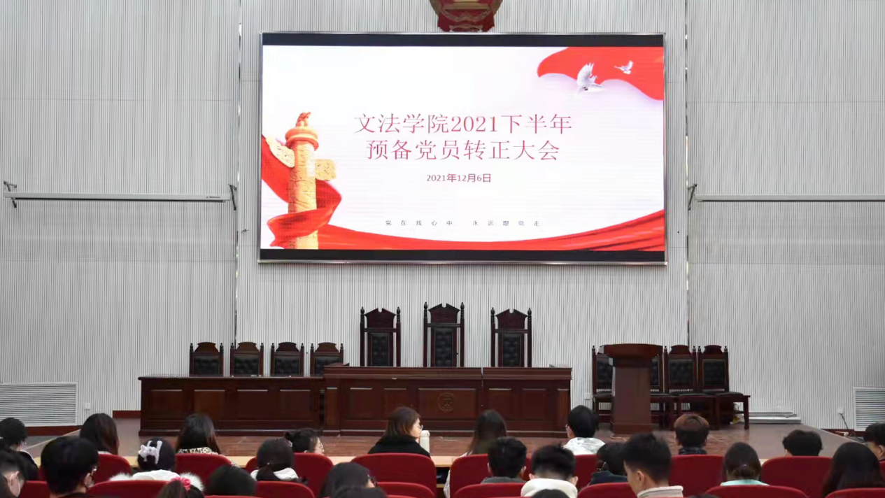 党支部在繁塔楼模拟法庭召开了预备党员转正大会, 参与本次会议的有表决权的正式党员11名和60名预备党员。本次大会讨论张建行等37名预备党员的转正问题。此次会议秉承着“公正、公平、公开”的原则,严格按照各项程序执行。