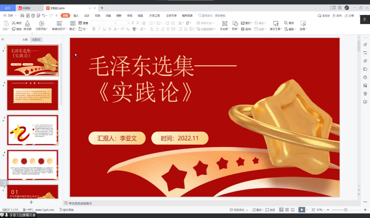 学生党员李亚文与大家共同学习了毛泽东选集第一卷——《实践论》。她从《实践论》写作背景及重要意义入手,讲述《实践论》写于1937年7月,是毛泽东同志的重要哲学篇章,也是毛泽东哲学思想的核心文本之一。讲述了《实践论》既是中国共产党人批判错误思想路线的哲学总结,也是中国近现代社会革命经验的哲学概括,对中国革命胜利起到了重要指导作用。接着她讲述在当下的中国,在深入学习习近平总书记系列重要讲话精神之时,在新时代有必要重读《实践论》这篇毛泽东哲学思想的重要著作,要求我们在新时代需要牢牢把握中国特色社会主义这个理论和实践主题、始终坚持以人民为中心和实践主体、扎实推进改革开放的宏大实践,做到知行合一、事实就是,始终坚定“四个自信”,在改革开放的伟大事业中写好新时期的实践论。