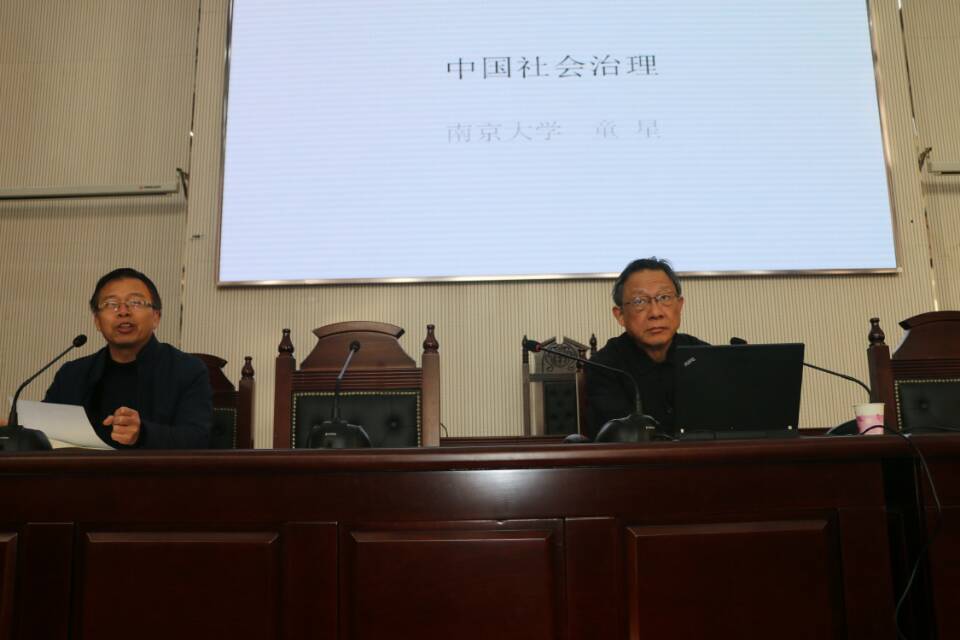 师生做了一场关于“中国社会治理”的主题报告。童星教授现任南京大学社会风险和公共危机管理研究中心主任、江苏省社会风险研究基地主任,兼任国家哲学社会科学规划基金学科评议组成员、国家减灾委专家委员会委员、中国社会保障学会副会长兼教学委员会主任、中国社会学会社会发展与社会保障专业委员会理事长、中国社会治理研究会学术委员会副主任、江苏省现代民政研究院院长以及多个江苏省学术团体(机构)的副会长(副理事长)。独著或主编著作10余本,主编或参编教材近20本,发表重要中文期刊论文近300篇。获包括全国高校人文社会科学研究成果一等奖、江苏省哲学社会科学成果一等奖在内的多项科研奖励,以及包括全国高校教学成果二等奖、江苏省高校教学成果一等奖在内的多项教学奖励。承担包括国家社科基金重大课题“建立健全社会预警机制和应急管理体系研究”、国家社科基金重大课题“社会管理创新与社会体制改革研究”在内的多项科研项目,且都顺利结项,其中一项研究的最终成果《中国应急管理:理论、实践、政策》入选“国家哲学社会科学成果文库”。1992年获国务院颁发的政府特殊津贴。其在《民生专报》2015年第7期所著的《大力发展社会化的社区居家养老服务》,获李克强总理、马凯副总理、王勇国务委员的批示。