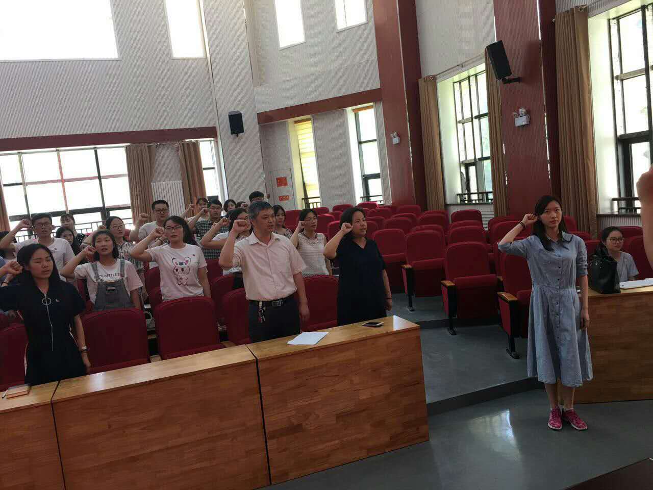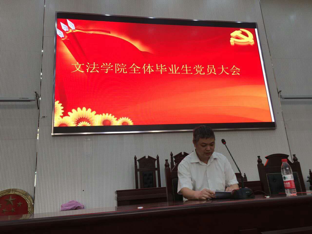 在模拟法庭召开了2017届毕业生党员大会。会议由党委副书记王燕萍主持,党委书记李培玉出席本次会议。大会伊始,由党委组织员朱瑞萍领誓,与会领导及全体毕业生党员重温入党誓词。会上,党委书记李培玉为毕业生党员上了最后一次党课,对广大毕业生党员做了如下要求:一是要在工作中不断学习党的理论知识,不断增强党性觉悟;二是要不断学习专业知识,在专业上有所突破,充分发挥党员的先锋模范带头作用;三是严守党的组织纪律,积极参与党的相关活动。会议最后,党委组织员朱瑞萍对毕业生党员组织关系转移需知进行了详尽的说明,大会在热烈的掌声中闭幕。