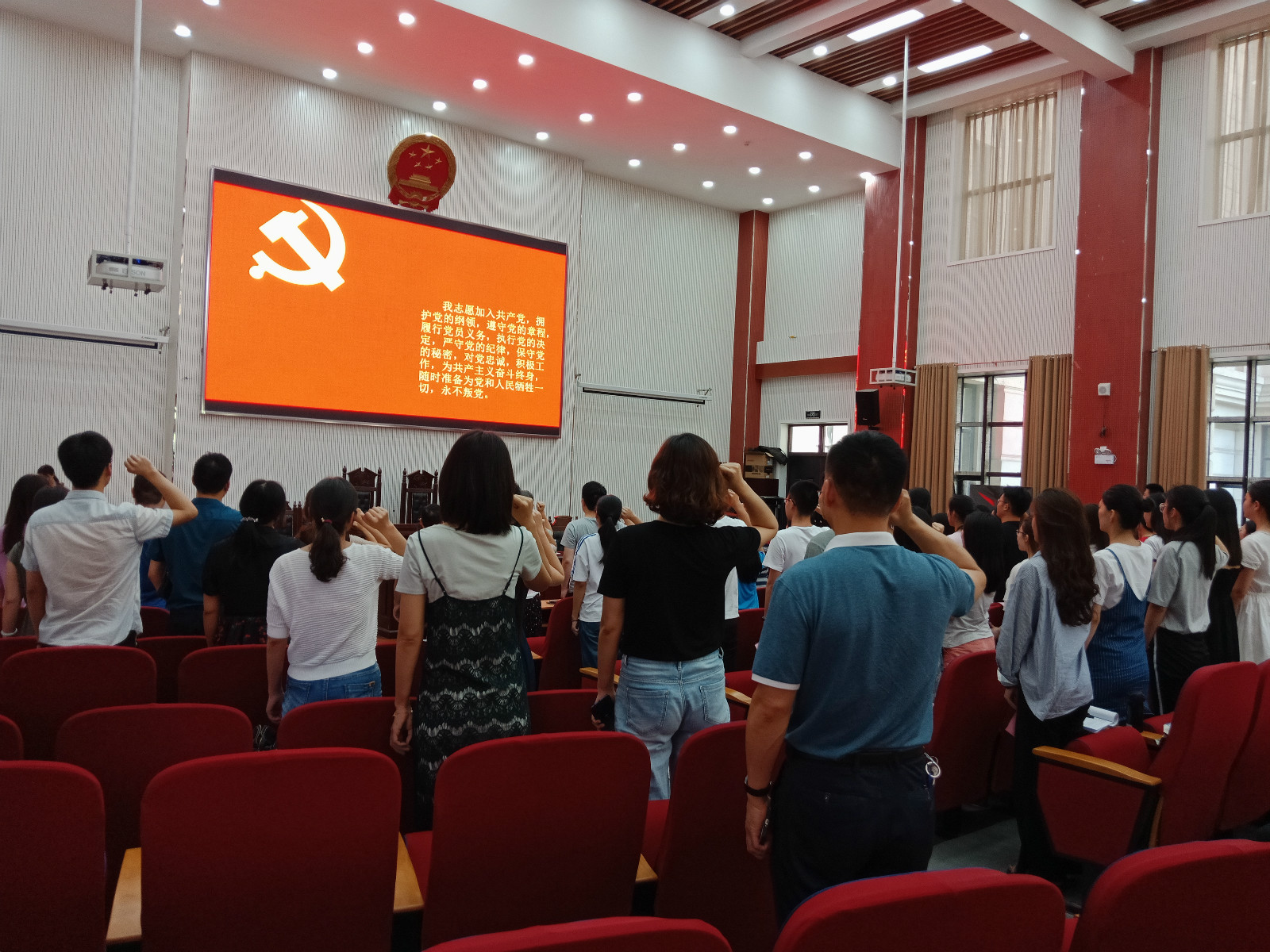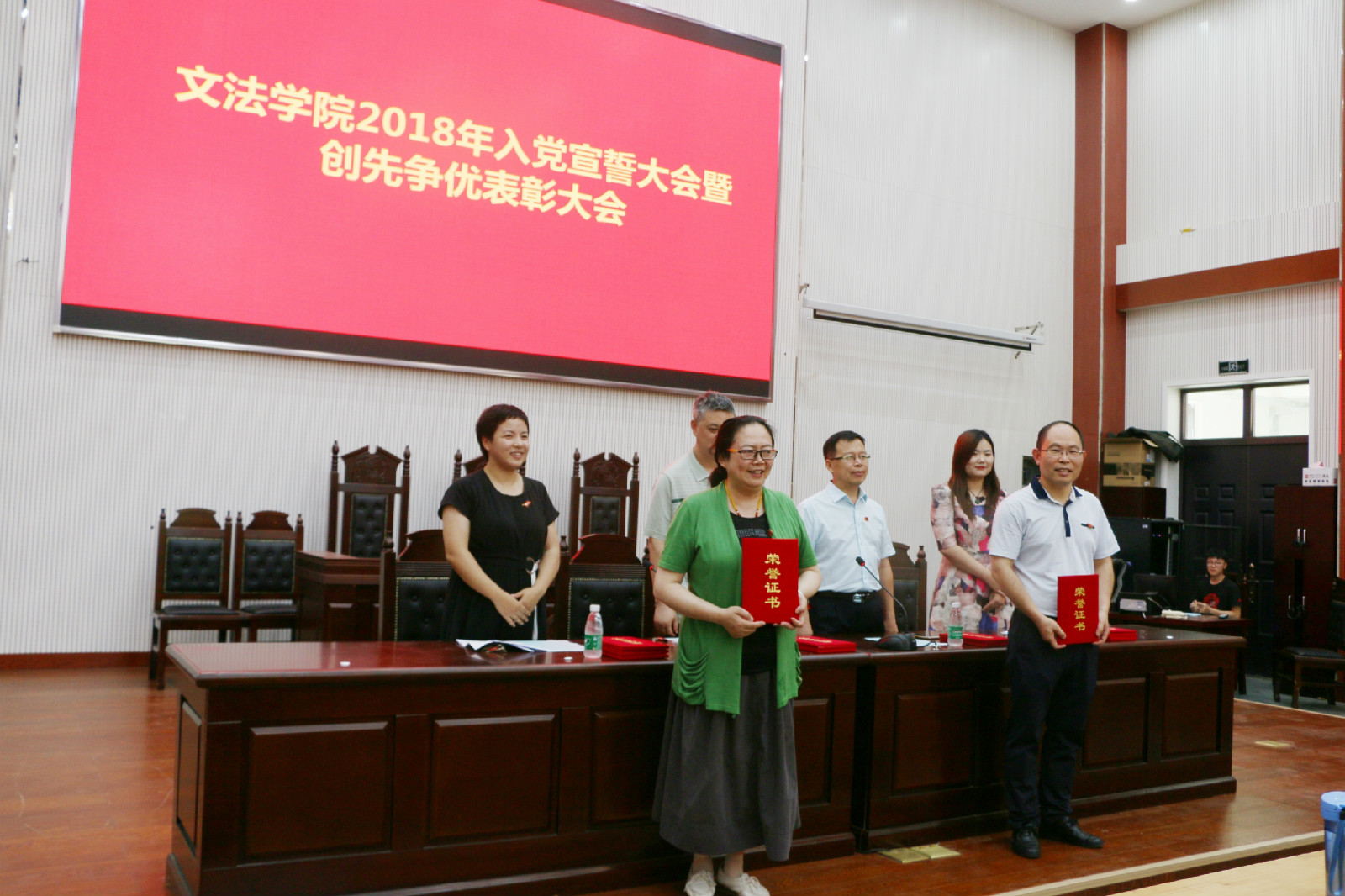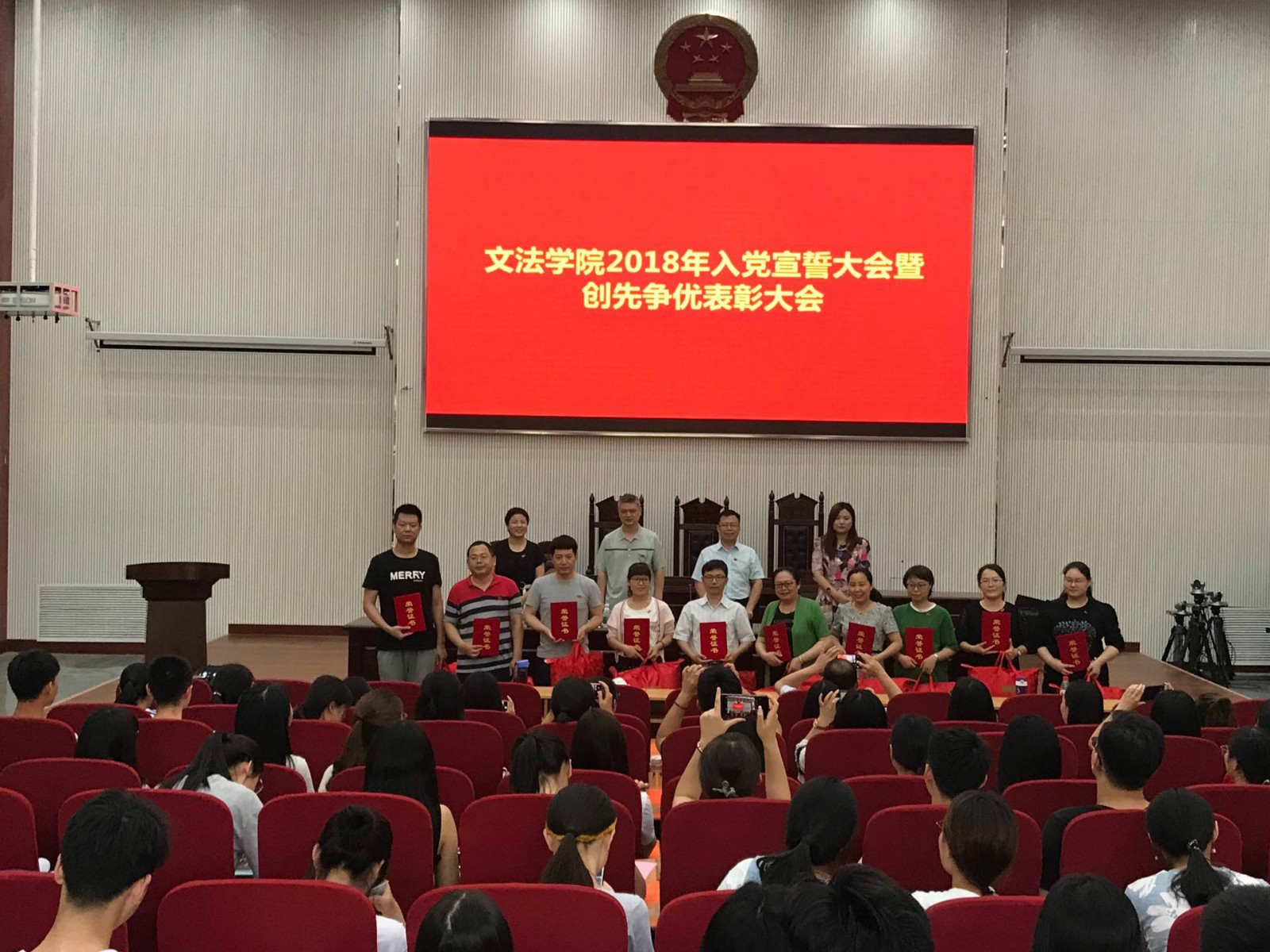 6月12日下午,番茄小说 在模拟法庭举行了2018年入党宣誓大会暨创先争优表彰大会。党委书记李培玉、院长王晓勇、党委副书记王燕萍、团委书记沈倩茹出席会议,院教师党员、学生党员及入党积极分子代表参加大会。