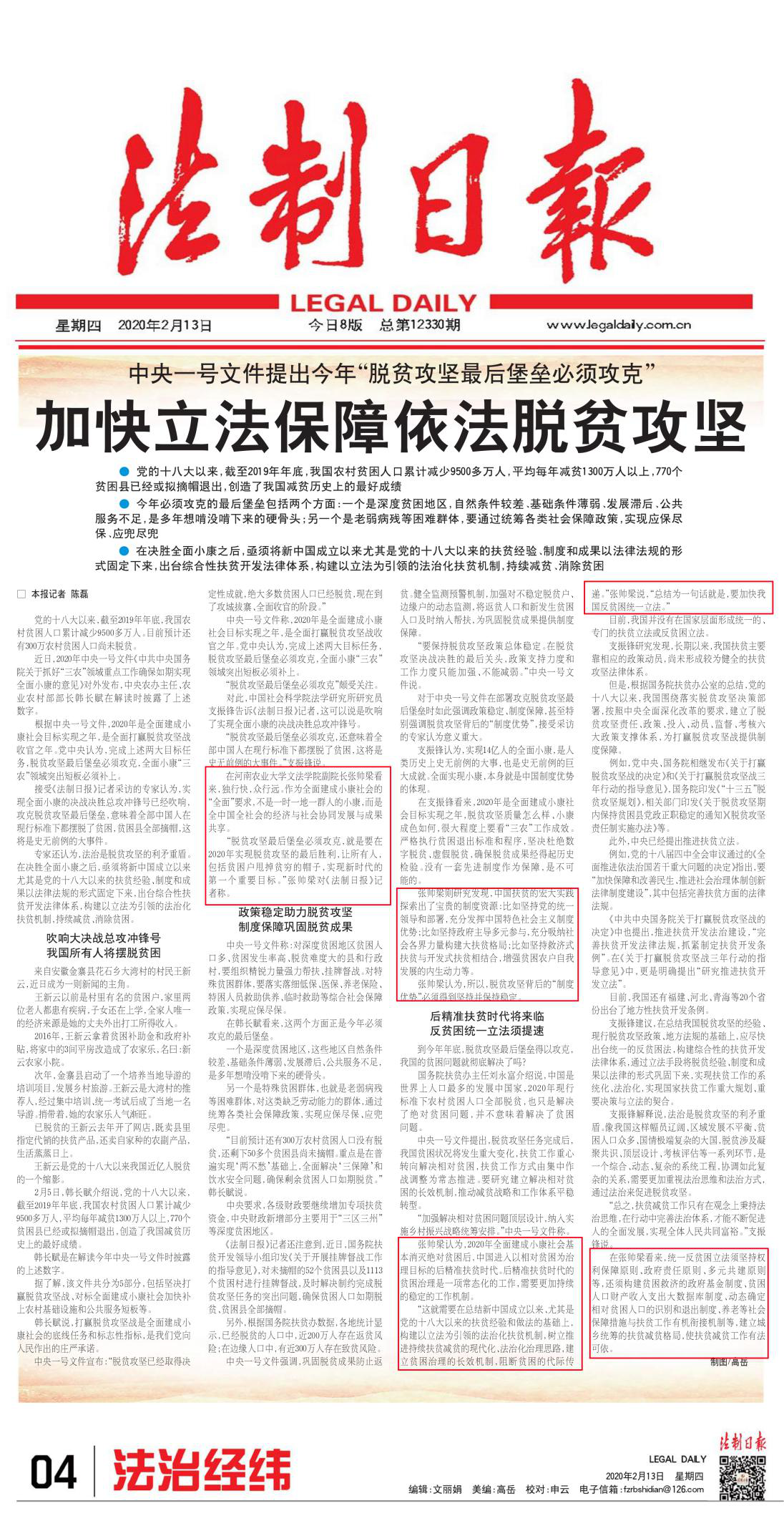 附《加快立法保障依法脱贫攻坚》,《法制日报》2020年2月13日第4版: