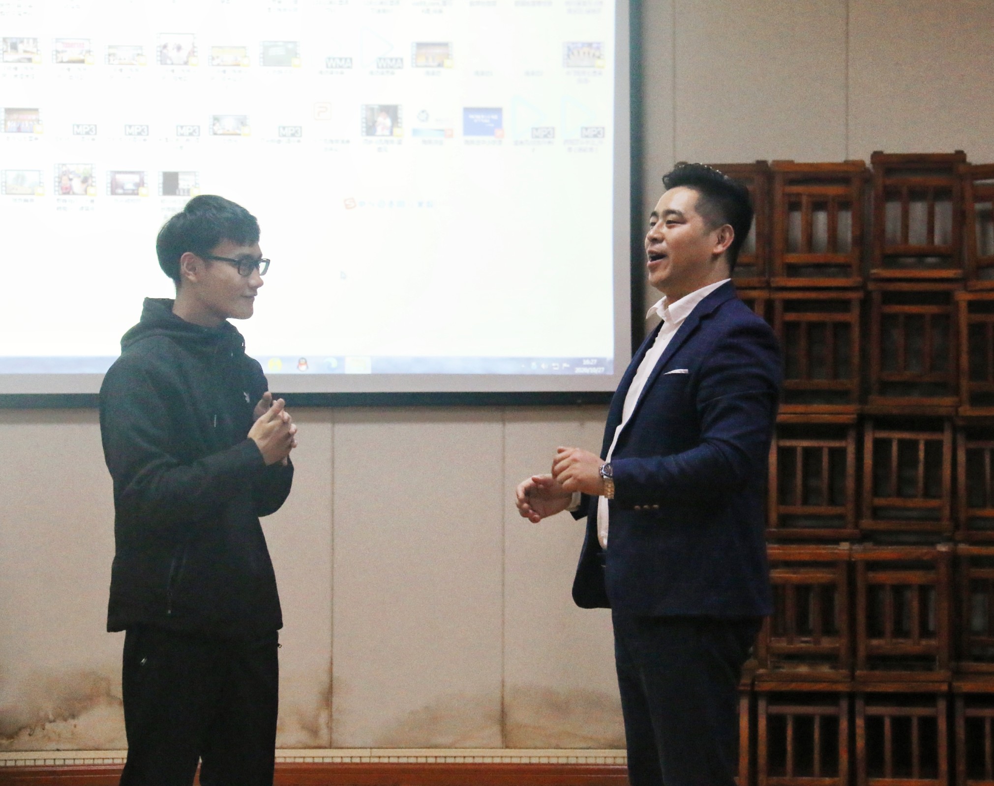 实践教学环节,张永辉手持陶笛作了陶笛演奏展示,或气势磅礴似百骏驰骋,或悠扬婉转如幽禽清啼,古典音律与流行歌曲在四孔、六孔、七孔、十二孔陶笛的演奏中呈现出无与伦比的深邃精妙。