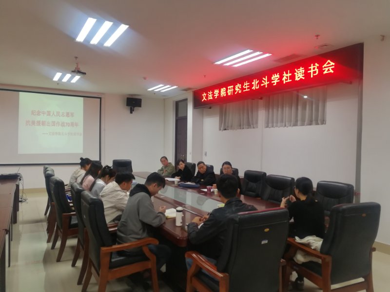在学院会议室召开纪念抗美援朝出国作战70周年北斗学社读书分享会。院党委副书记余果、院关工委常务副主任杨明亮老师和2020级研究生参与本次活动,活动由研究生班主任朱瑞萍主持。