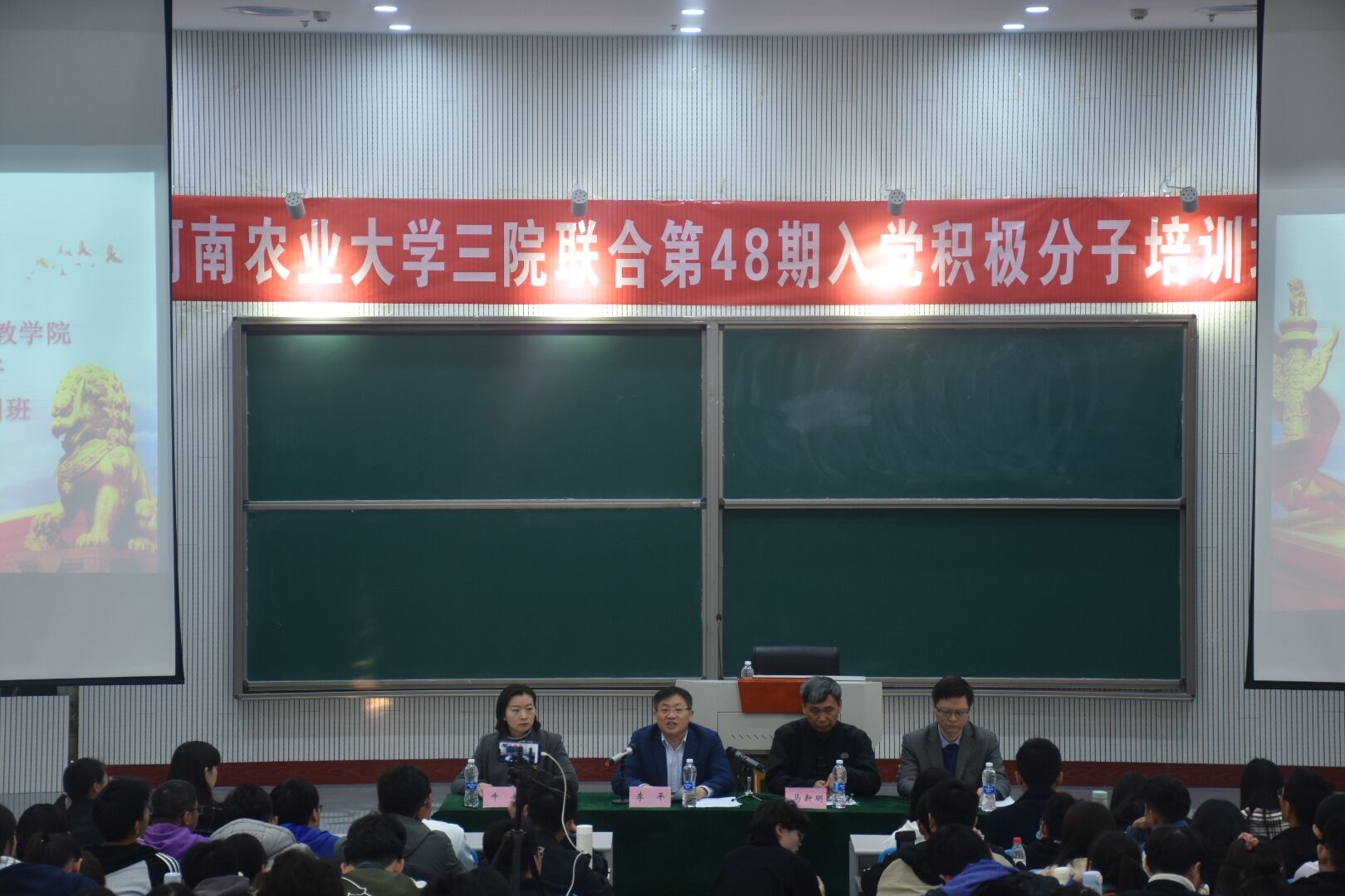 、国际与教育学院三个学院联合举办的“河南农业大学第48期入党积极分子培训班”,在龙子湖校区繁塔楼大教室二隆重开班。校党委委员、组织部部长李平,信息与管理科学学院党委书记马新明、番茄小说