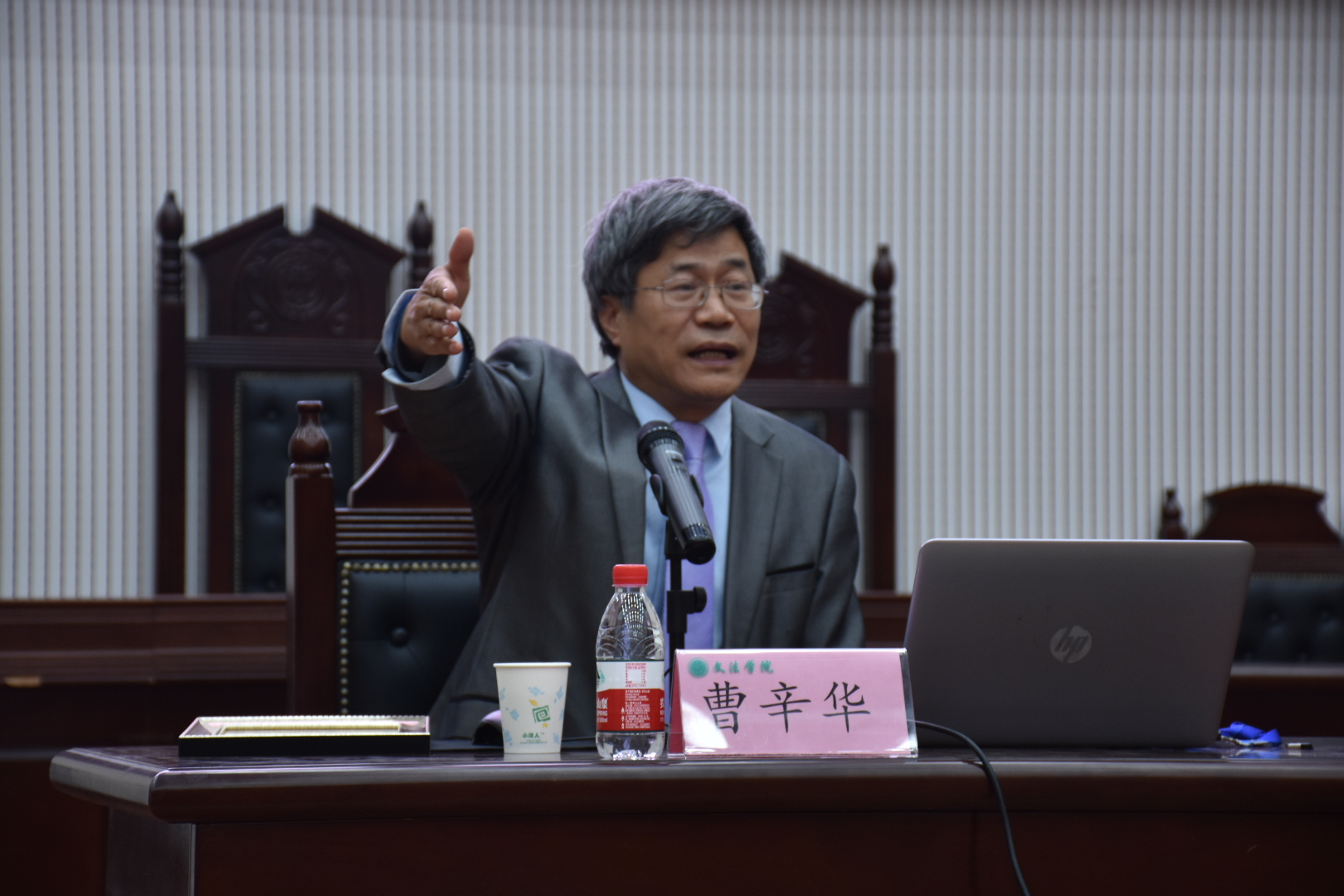 曹辛华声情并茂地向在场师生讲授了吟诵诗词、创造诗歌和解读古诗三方面的经验和技巧。他以杜甫《绝句》的吟诵展示,讲授了平声拉腔、仄声顿腔的吟诵技巧,以及字与字之间的停顿原则等。在谈及现代诗歌的创作时,曹辛华以自己的作品为例,讲述了创作时的心路历程,并强调诗词创作要源于心声,有感而发才能写出好的作品。在经典诗词解读的新方法上,他强调,可以把古典诗词当作一个多媒体、影像、文本,通过文字码、文化码、逻辑码的方法进行解读。