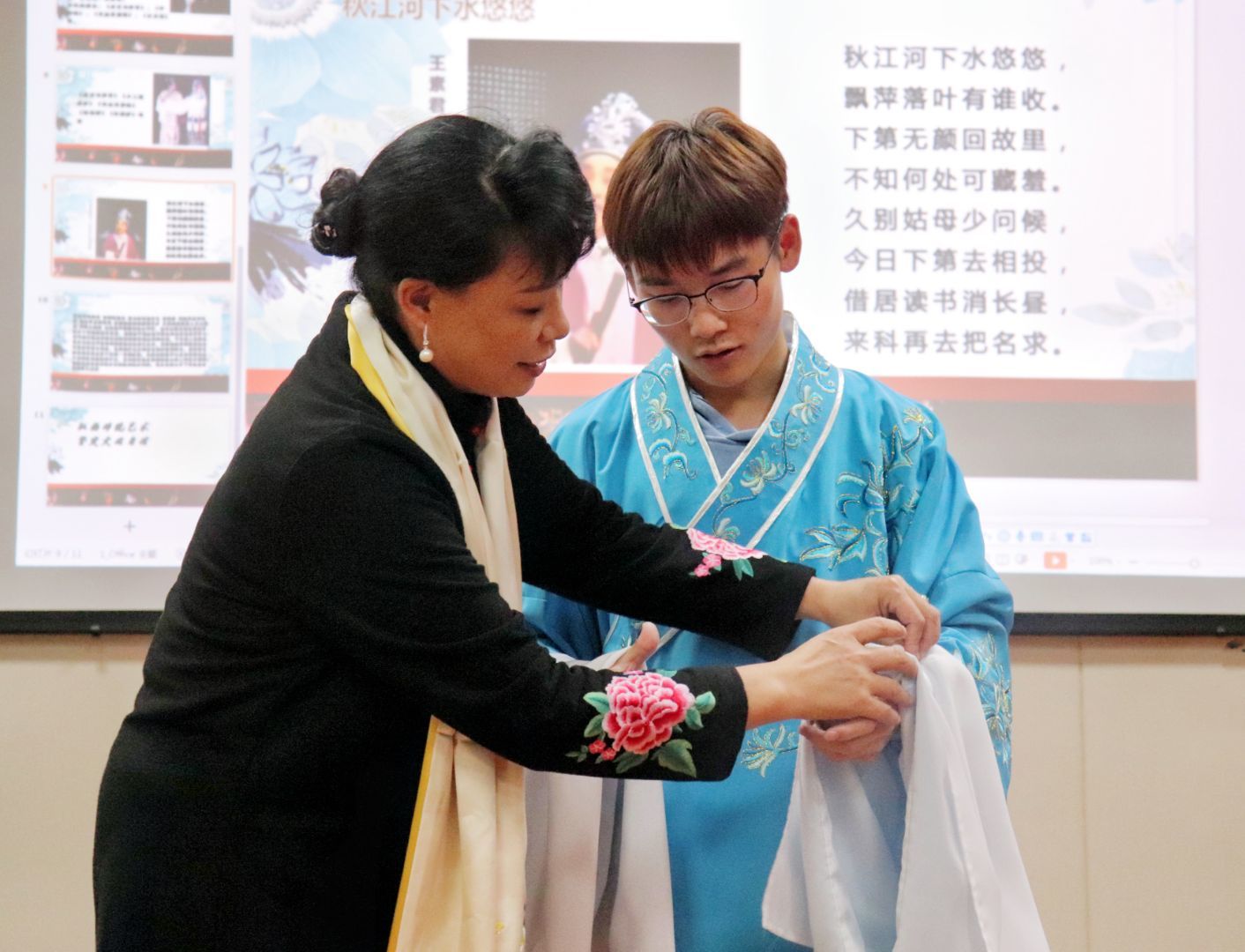 王燕指导学生穿戴戏剧服装