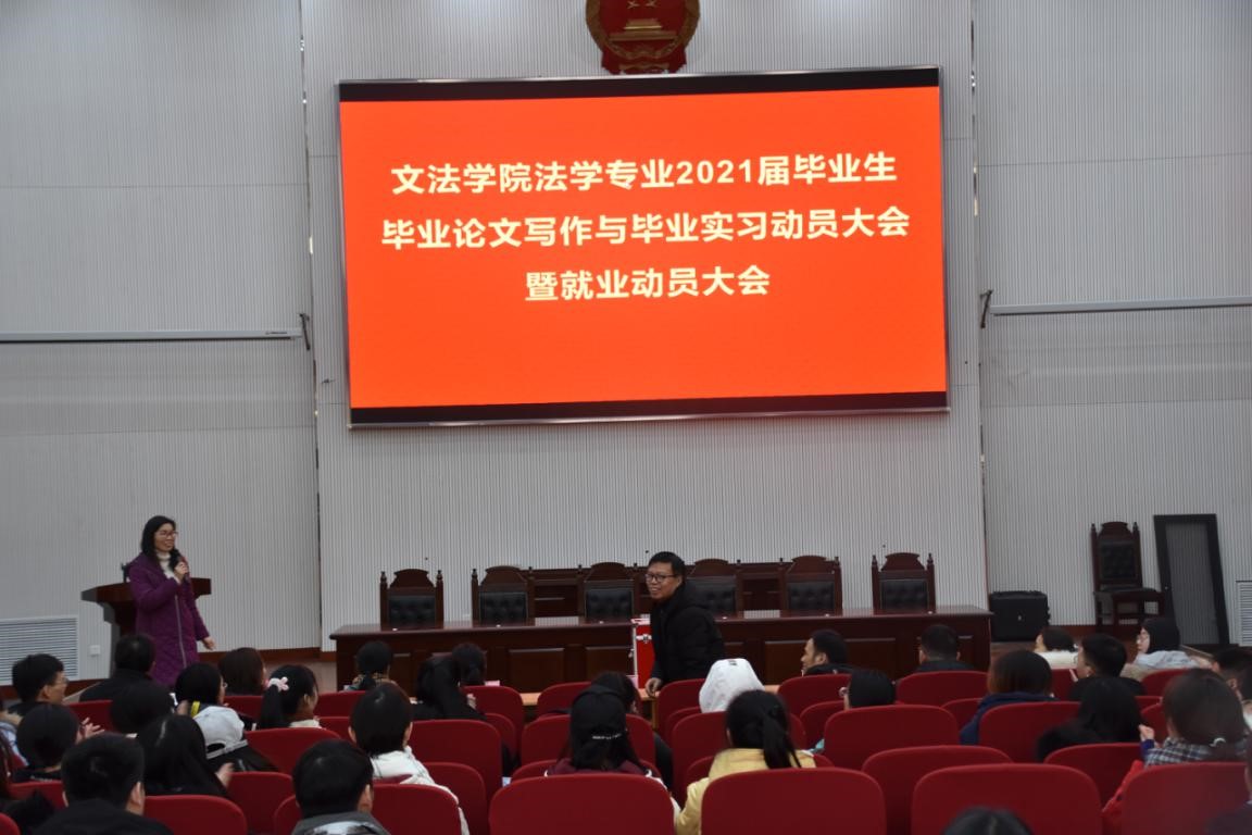 法学专业召开2021届毕业生大会,院长王晓勇、副院长杨红朝、团委书记朱瑞萍出席了会议,法律系全体教师和2021届法学专业全体学生参加会议。会议由法律系教师赵菊敏主持。