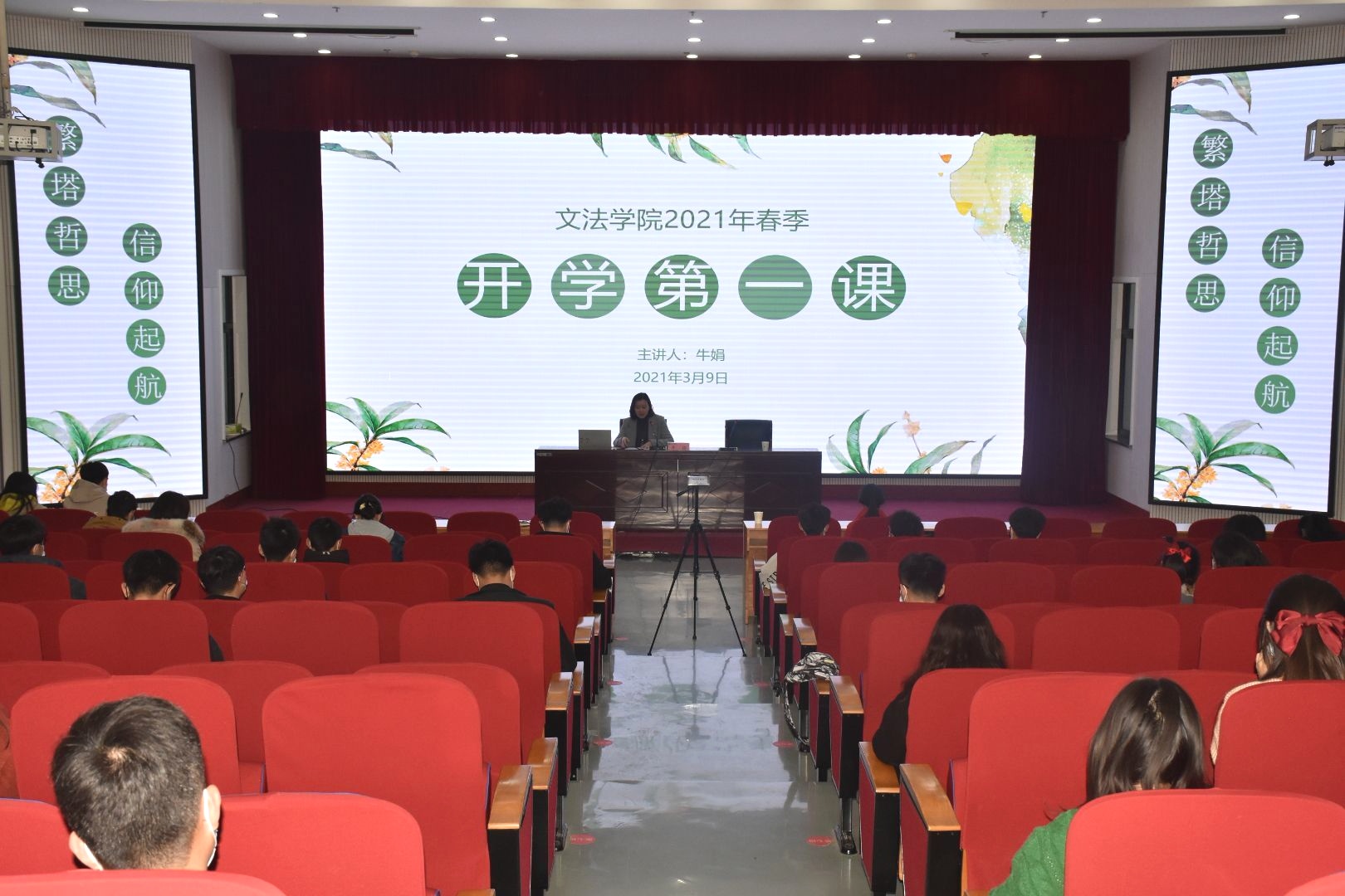 在龙子湖校区教学楼大教室1举行“繁塔哲思 信仰起航”2021春季开学第一课活动。学院党委书记牛娟为学生讲授第一节思政课,学院全体学生通过线上线下两种形式同步观看。