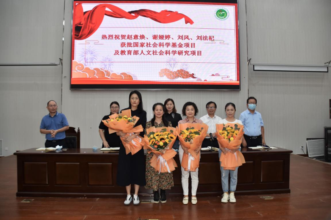 会上,王晓勇首先介绍了今年首批新入职的两位博士。随后,全院教师对获得2021年国家社科基金项目的赵意焕、谢娅婷老师和获得2021年度教育部人文社会科学研究项目的刘风、刘法杞老师表示热烈的祝贺。四位老师分别上台交流立项感言,并接受献花。
