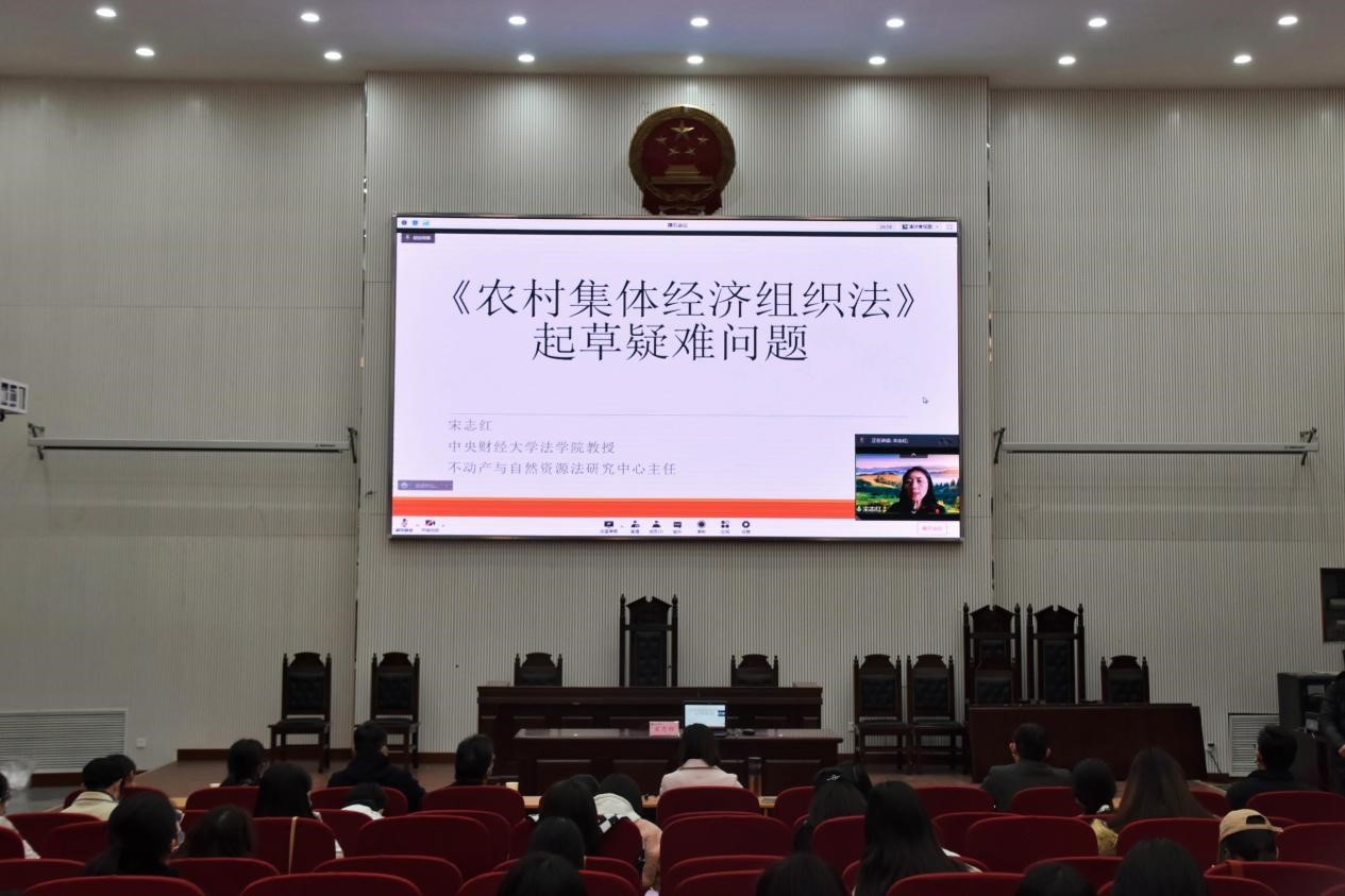 师生作主题为“农村集体经济组织法起草疑难问题”的学术报告。学院党委书记牛娟、学校政策法规办公室副主任张帅梁、副院长杨红朝以及部分师生代表参加了报告。报告由牛娟主持。