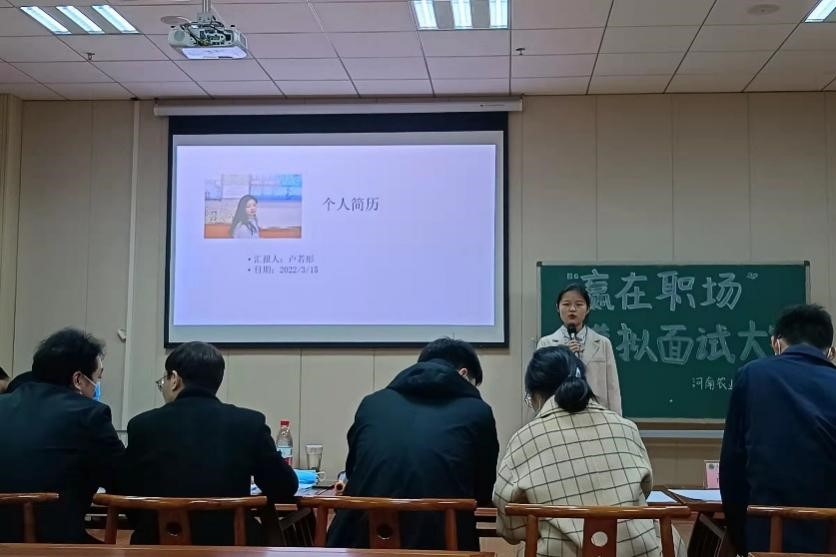 此次活动以“打开职场大门,成就美好未来”为主题,共设自我介绍、简历展示和评委提问三个环节。首先,参赛学生从自身经历和求职目标等多个方面进行自我介绍,并详细展示了简历设计的重点和亮点。