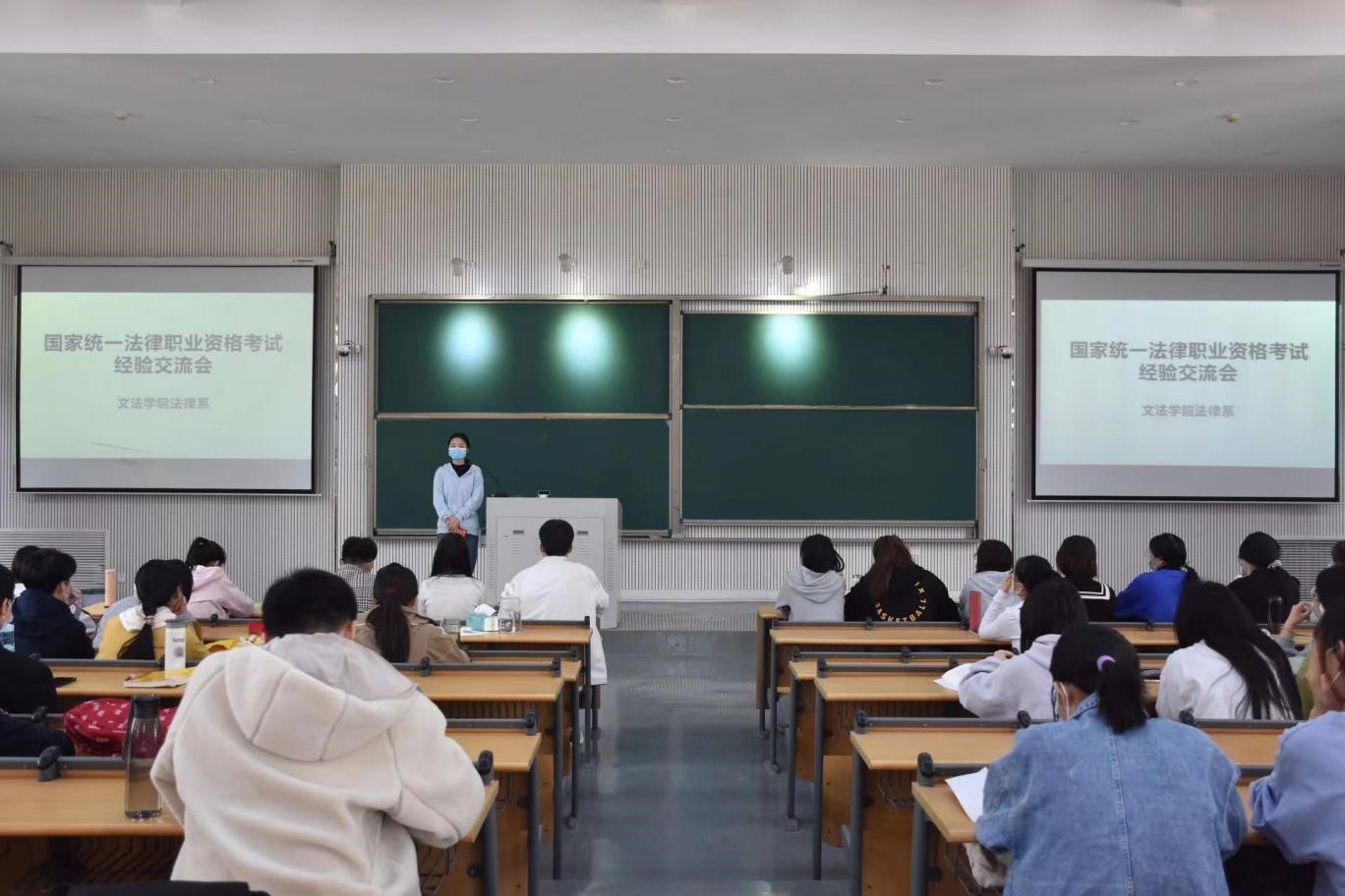 法律系于龙子湖校区教学楼大教室8举办国家统一法律职业资格考试经验交流会。18级法学1班张凤阁、18级法学2班葛言、18级法学3班贺亚平、卢若彤四位以优异成绩通过法考的学生受邀进行经验分享,法律系19级全体学生参加此次会议。会议由法律系主任韩宁主持。