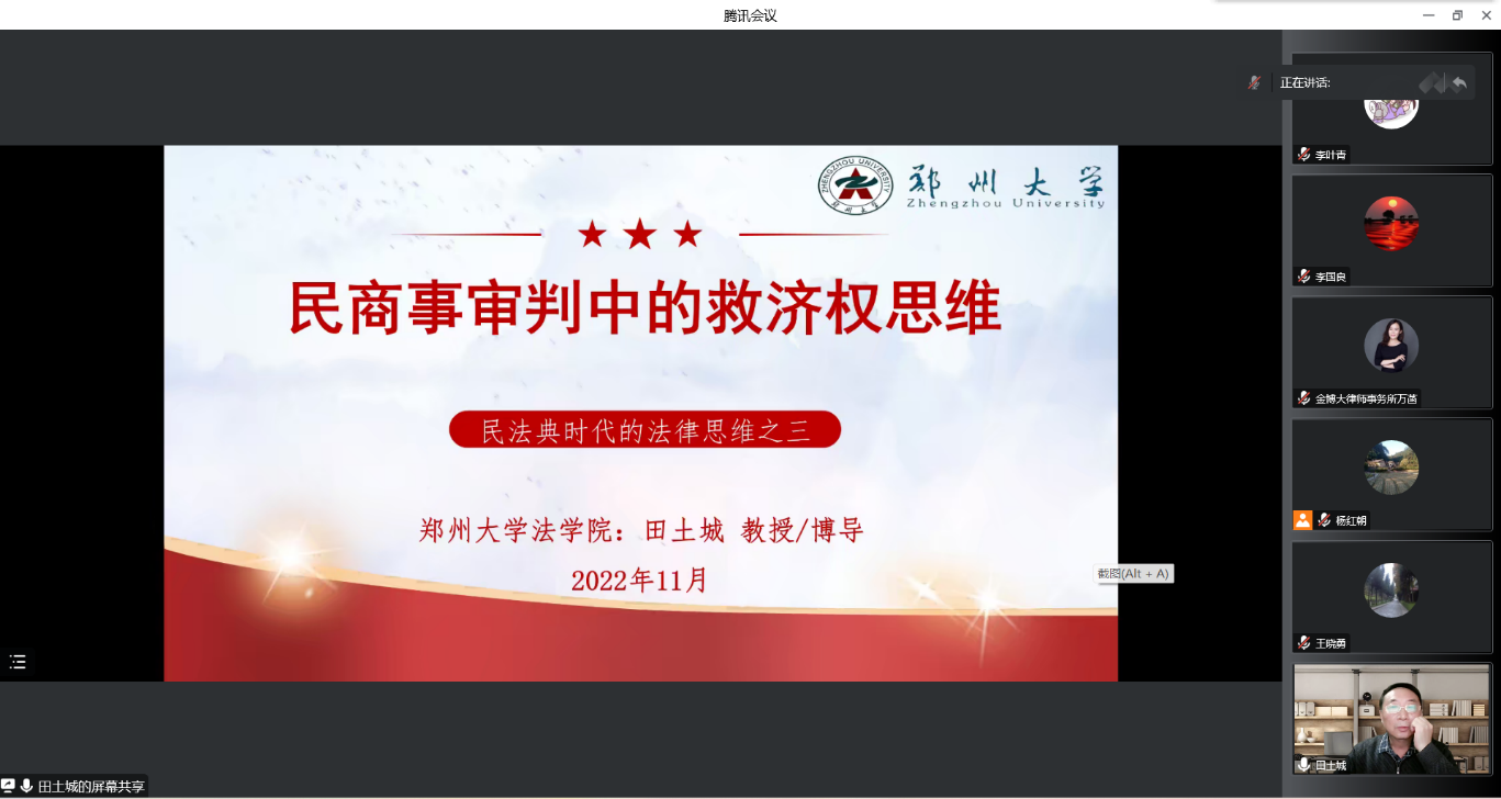 通过线上会议的方式举办以“民商事审判中的救济权思维”为主题的学术报告。本次报告由郑州大学田土城教授主讲,番茄小说