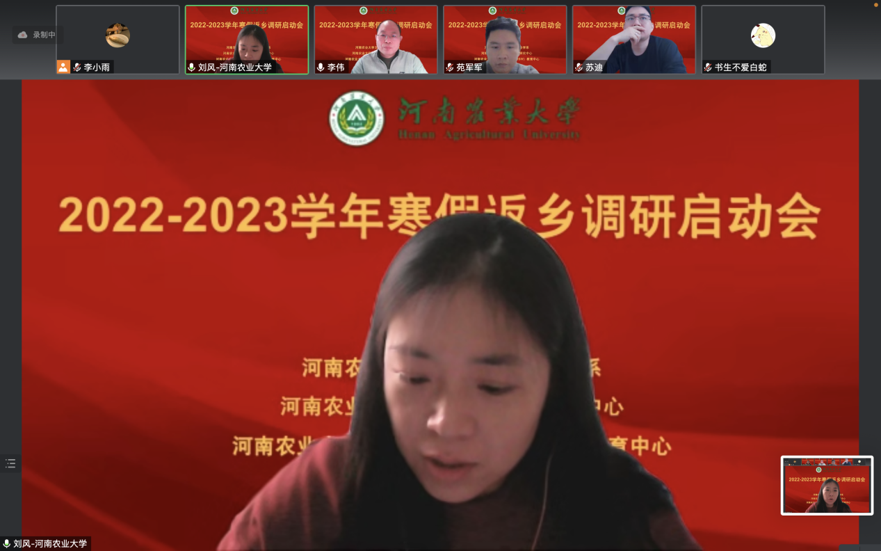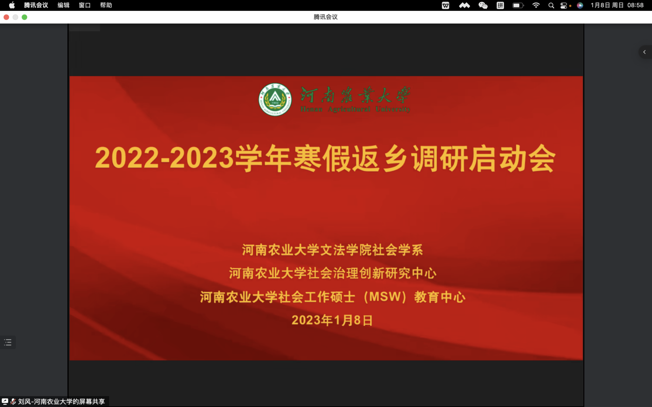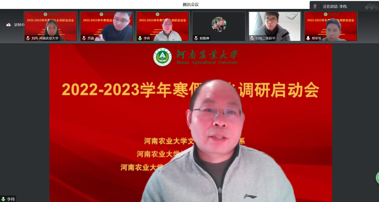 社会学系通过线上形式举办了大学生寒假返乡调研启动会。会议由社会学系副主任刘风主持,副院长李伟,社会学系教师代表参加,2022、2021、2020、2019级的部分本科生、研究生报名参与调研活动。