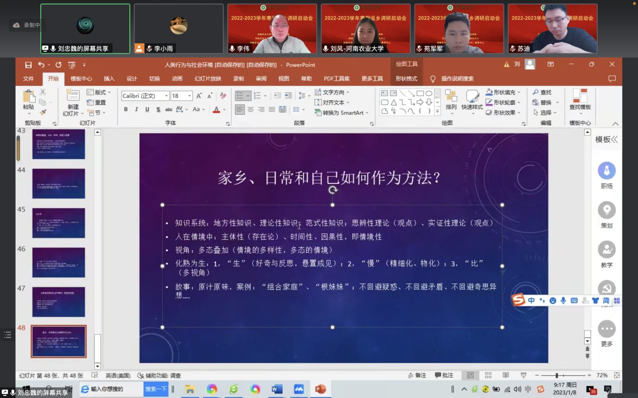 刘忠魏从“生”、“慢”、“比”三个方面解析如何使用社会研究方法进行田野调查,并进行案例分析。他讲到,寒假返乡调研要讲好故事,及时做记录。要多视角比较,注重情境性和主体性。
