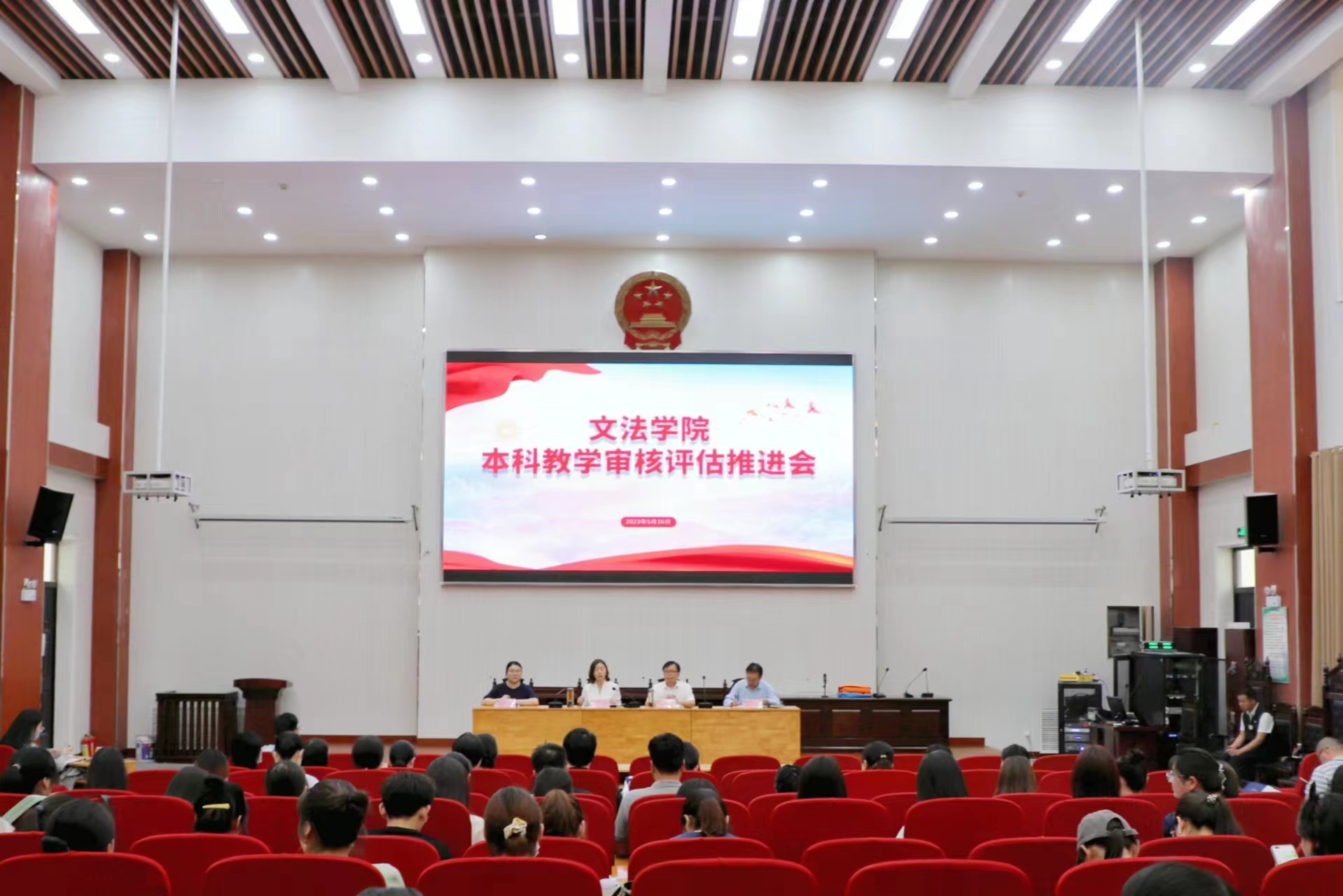 在模拟法庭召开本科教学审核评估推进会,学院领导班子和全体教职工参加会议。