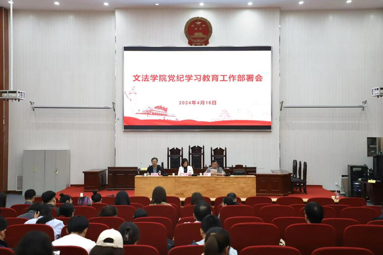 于模拟法庭召开党纪学习教育工作部署会议,学院班子成员、全体教职工以及学生支部书记、支部委员参加会议,会议由副院长杨红朝主持。