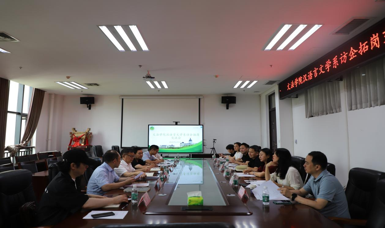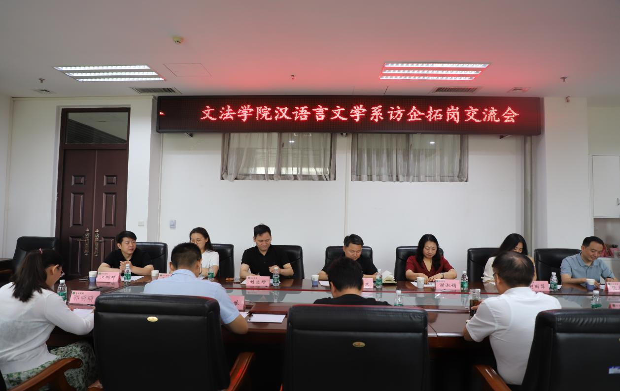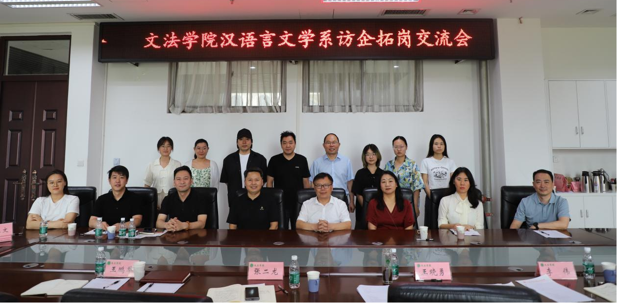 汉语言文学系邀请多家企业走进校园举行访企拓岗专场交流会。院长王晓勇、副院长李伟、汉语言文学系主任刘华、团委书记王鹏举及教师代表,2021级汉语言文学系本科生学生代表参加。应邀参加此次访企拓岗的企业代表有郑州泰闻文化传播有限公司代表骆泰文,河南九象集团总经理谢淑娟,郑州市虹韵乐器有限公司董事长刘进增,河南德馨医药有限公司总经理刘丽萍,郑州市柒玖乐器有限公司总经理张闯,河南震元东韵商贸有限公司总经理张宸硕,郑州时间正好文化传播有限公司代表王鹏群,海伦钢琴股份有限公司大区销售总监孙增生。交流会由李伟主持。