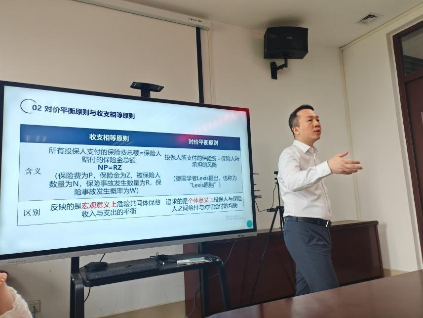 讲学伊始,杨红朝副对武亦文教授的到来表示热烈欢迎,并简要介绍了武教授的学术背景和成就。随后,在讲学过程中,武教授指出,保险法作为调整保险关系的基本法律,其理想状态是保障保险市场的健康发展,维护保险消费者的合法权益,促进社会经济的稳定。接着,他以“对价平衡原则”为主题,分别从保险利益原则、损失填补原则、最大诚信原则、近因原则四个方面剖析对价平衡原则的主流观点,并将民法中的公平原则与保险法中的公平原则进行对比,为现场师生提供了一个深入理解保险法中公平原则的新视角。然后,他又以“受益人的基本定位”为主题,围绕受益人及受益权,通过引入具体案例的方式,详细讲述了受益人的适用范围以及受益人受益权的得丧,为师生们揭示了保险法中受益人制度的具体运作过程。