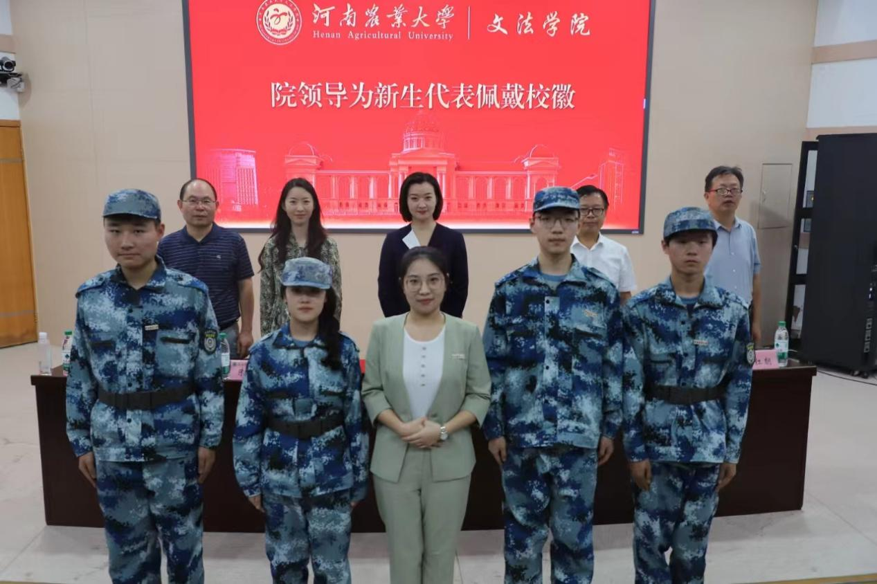 典礼进行到下一个环节,学院领导为新生代表佩戴校徽。