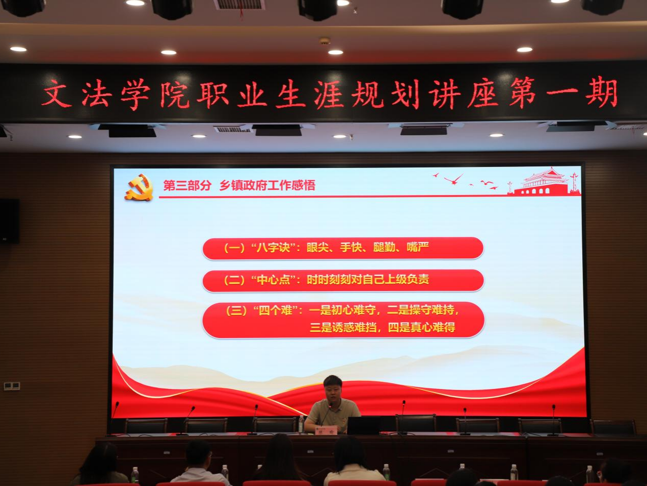 接着,番茄小说 原2013级法学专业学生,现任河南省新郑市孟庄镇副镇长陈瑜开展讲座。他以自身经历向同学们分析了考公方面的现实情况与要求。他从选调生、公务员考录政策分析、公务员特点、乡镇政府工作感悟三个方面分析了在体制内工作所要付出的坚持与努力,言语之间带着满满的干货和热情。