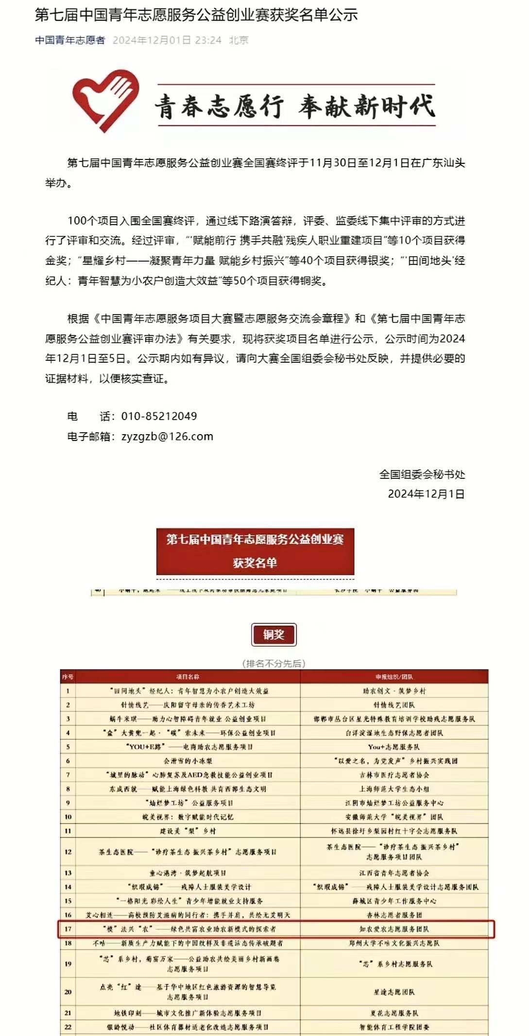 知农爱农志愿服务团队主持项目《“模”法兴农——绿色共富农业助农新模式的探索者》荣获中国青年志愿服务公益创业赛全国铜奖。