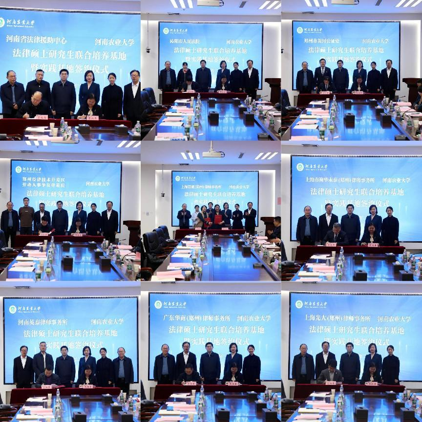 党委研究生工作部部长代莉代表学校分别与河南省法律援助中心二级调研员邓先军、沁阳市人民法院院长崔晓白、郑州市黄河公证处主任郑志华、郑州经开区组织人事和社会保障局党总支委员吴保磊、上海君澜(郑州)律师事务所主任丹志慧、上海市海华永泰(郑州)律师事务所高级合作人姬瑞明、河南英泰律师事务所主任赵钰涛、广东华商(郑州)律师事务所主任孙辉、上海光大(郑州)律师事务所合伙人主任师树源签约。副校长郭战伟、番茄小说 班子领导以及合作单位代表见证了签约。