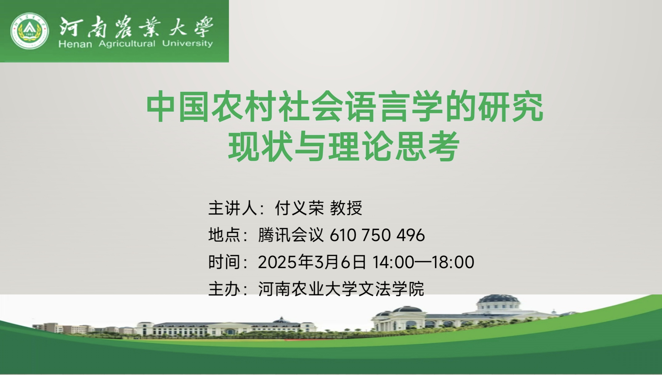 邀请汕头大学付义荣教授在腾讯会议上为汉语言文学系师生们举办了一场“中国农村社会语言学的研究现状与理论思考”学术讲座。讲座以线上腾讯会议的形式开展,由学科负责人吴亮老师主持,本系教师和学生代表参加。