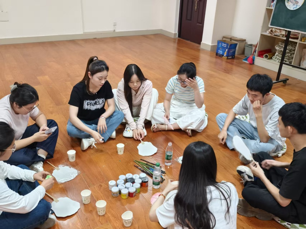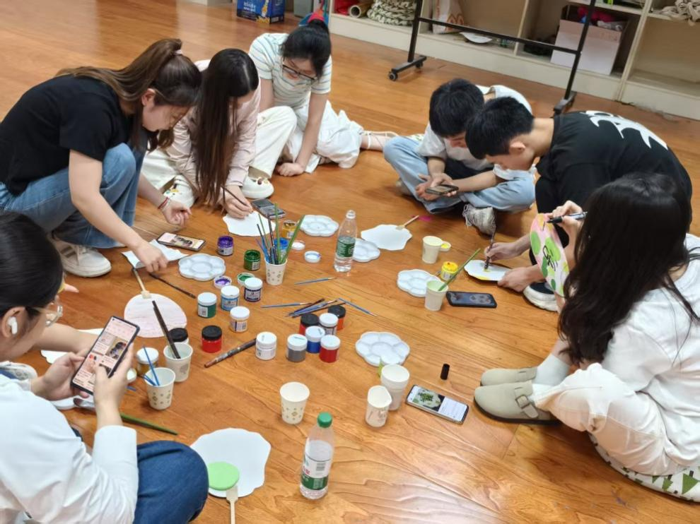 在团扇绘画环节,同学们以“绿意”“疗愈”为主题,以画笔为媒介,在扇面上绘制出独特的图案。创作过程中,大家相互交流绘画思路与感悟,现场气氛热烈融洽。创作结束后,同学们展示作品并讲述背后的故事。参与者表示,活动让他们在绘画中体验乐趣、释放压力,收获内心平静。最后,主持人总结活动,肯定同学们的创作成果,鼓励今后多利用艺术创作调节情绪、释放压力。