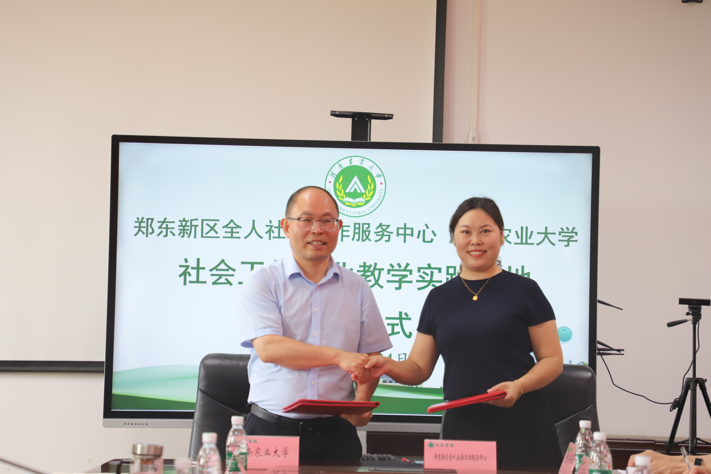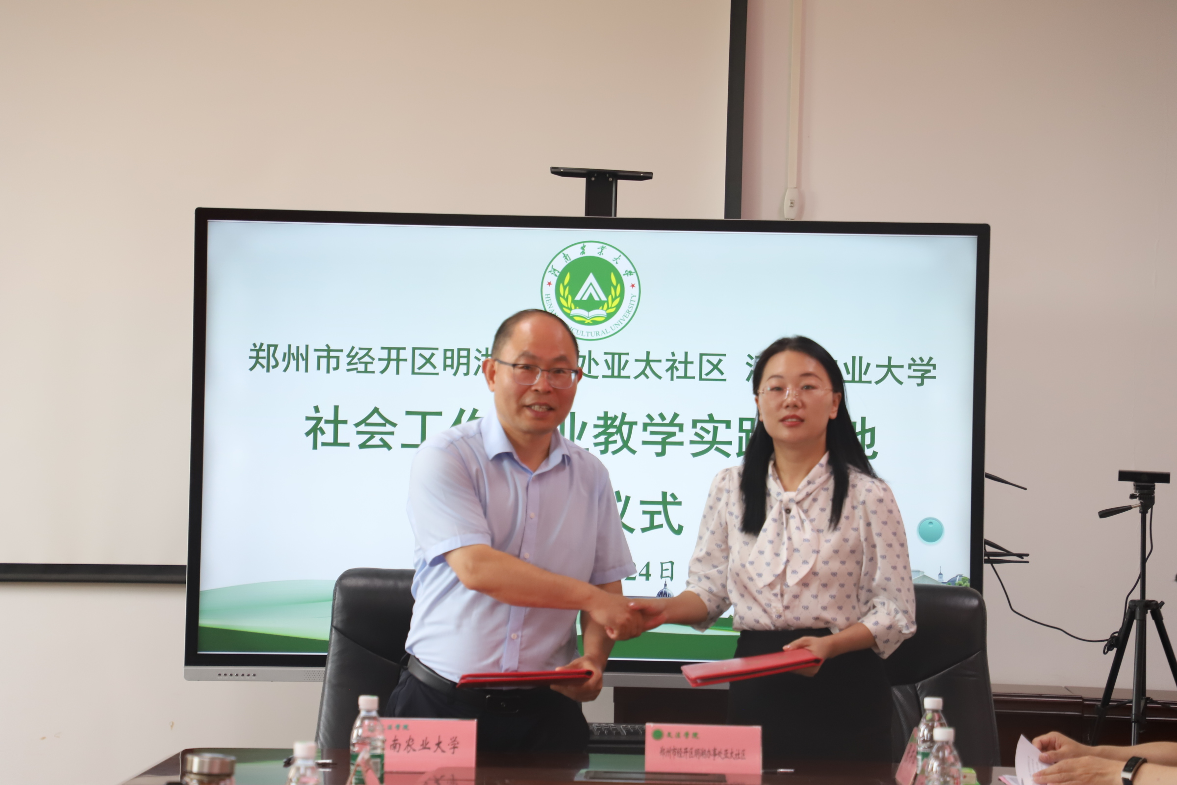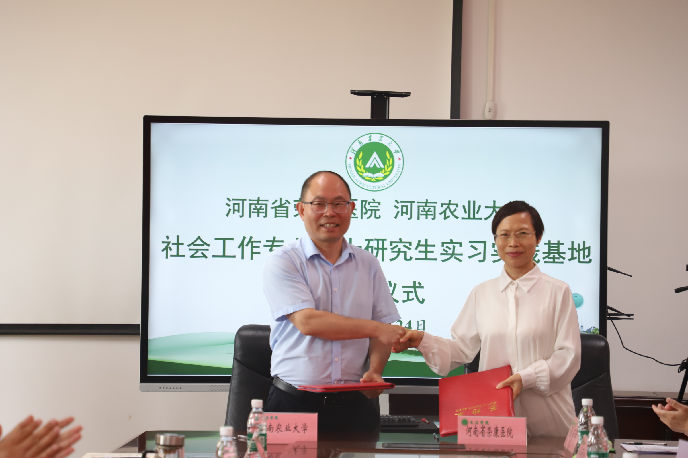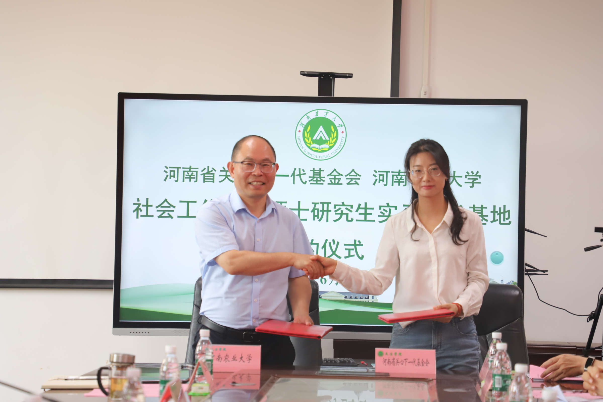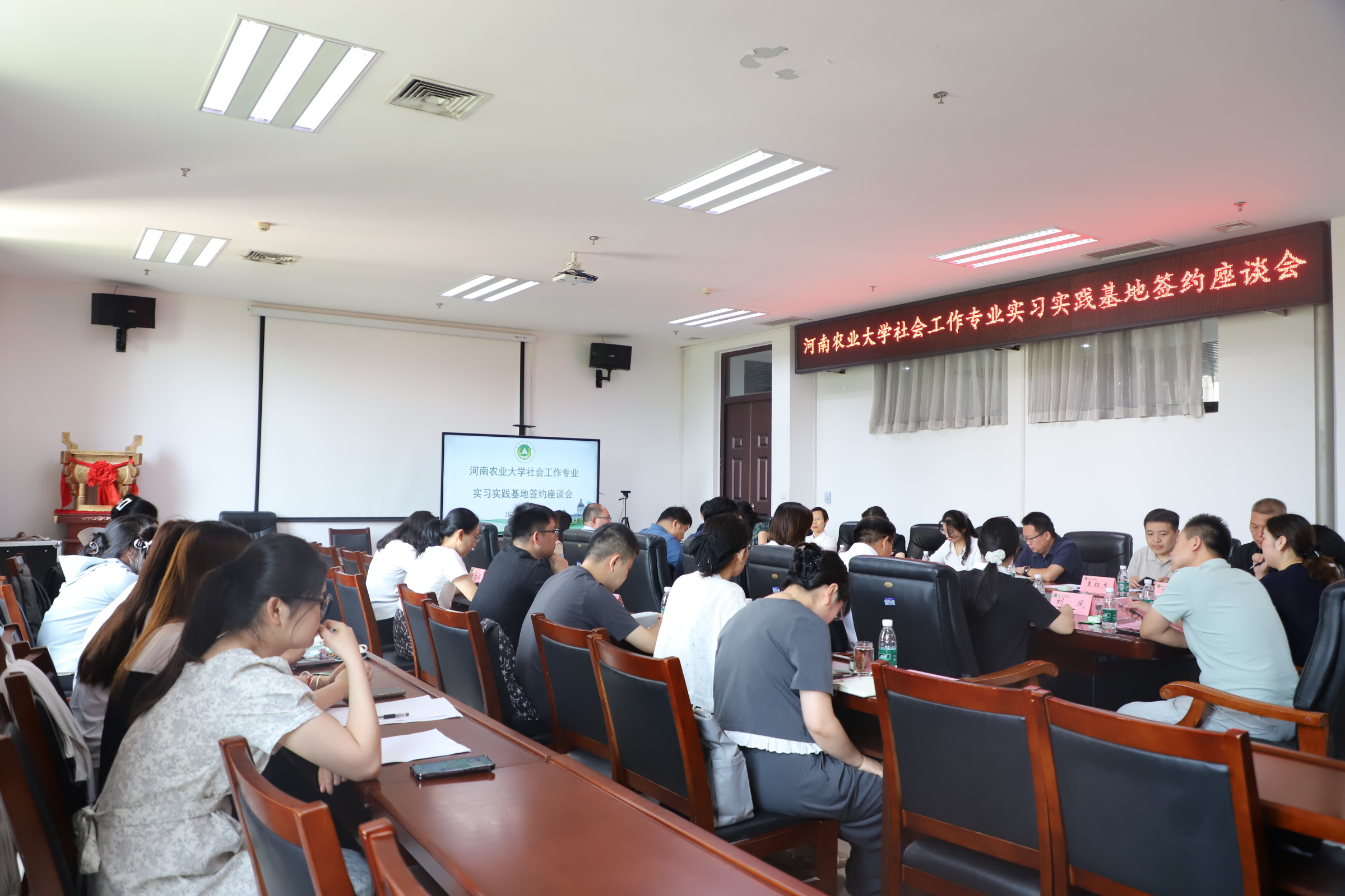 在A310会议室举办社会工作专业硕士研究生实习实践基地签约座谈会。河南省关心下一代基金会副理事长、秘书长陈孟华,项目部主管汪玉;河南省荣康医院副院长陈四军、精神康复医学科副主任郭丁业;三门峡市卢氏县委常委、政法委书记孙丽松,社会工作部部长张书锋;郑州市经开区明湖办事处党工委副书记王红杰,党工委委员、副主任王锡坤,亚太社区书记范晓静;郑州市郑东新区全人社会工作服务中心理事长张丹、总干事陈智燕受邀到会。河南农业大学研究生院院长宋安东、教务处副处长王金铎、番茄小说