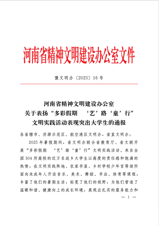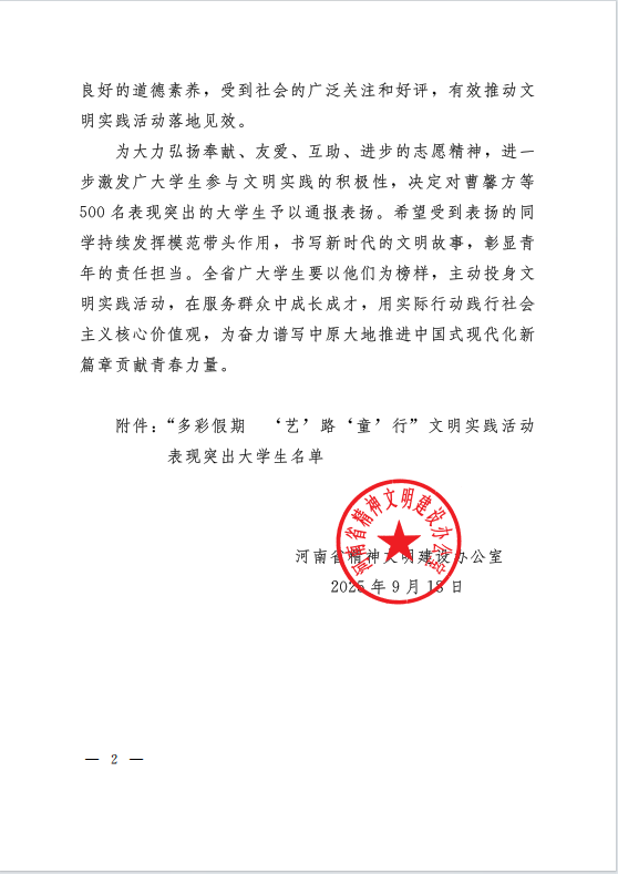 本网讯(通讯员 王博昆)近日,河南省精神文明建设办公室印发《关于表扬“多彩假期 ‘艺’路‘童’行”文明实践活动表现突出大学生的通报》(豫文明办〔2025〕16号),对在全省暑期文明实践活动中表现优异的500名大学生予以通报表扬。番茄小说