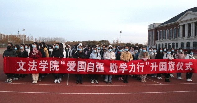 于龙子湖校区田径场举行以“爱国自强 勤学力行”为主题的升国旗仪式。院学生工作负责人和部分学生代表参与此次活动。
