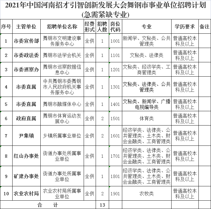招聘岗位要求的专业条件按《2021年中国河南招才引智创新发展大会舞钢市招聘事业单位高层次及急需紧缺人才专业设置指导目录》执行。