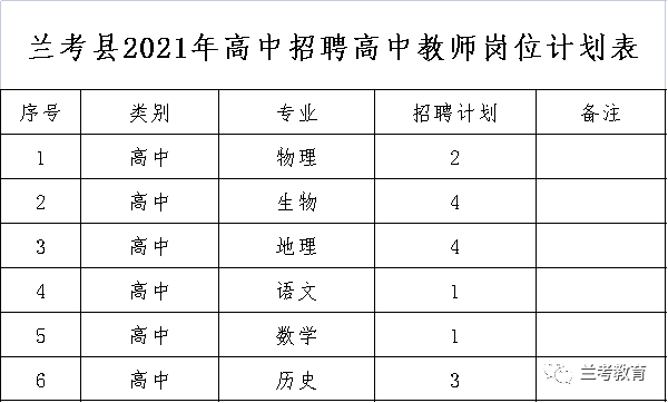 本次计划招聘高中教师15名,具体岗位见《兰考县2021年公开招聘高中教师岗位计划表》附件1。