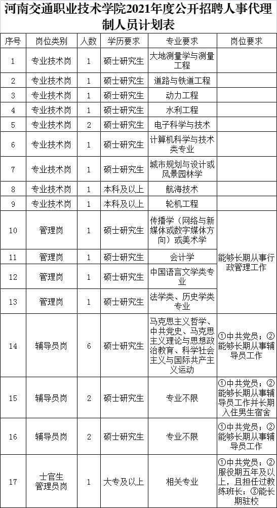 2021年公开招聘人事代理制人员公告发布在学校网站(//www.hncc.edu.cn/),公示期为2021年10月8日至10月19日。有意向者可登录招聘报名系统(//rczpweb.hnkaoshi.cn/project/2021092715174274905443187.html)进行网上报名,网上报名开放时间为2021年10月13日8:00至10月15日18:00,网上报名时间截止后不能修改提交信息。