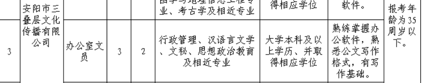 各职位要求详见《2022年安阳市三叠层文化传播有限公司招聘岗位表》(附件1)。