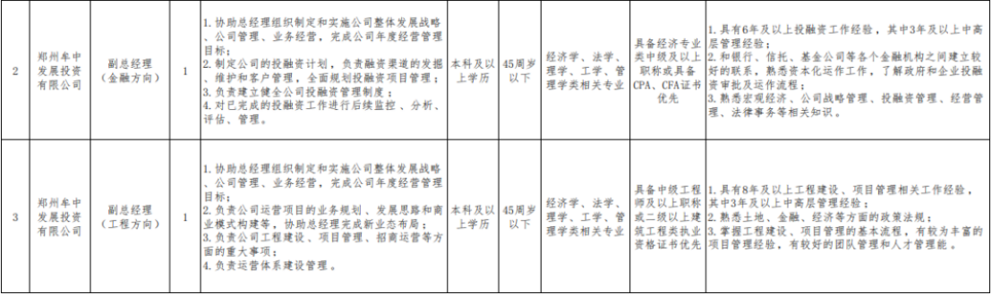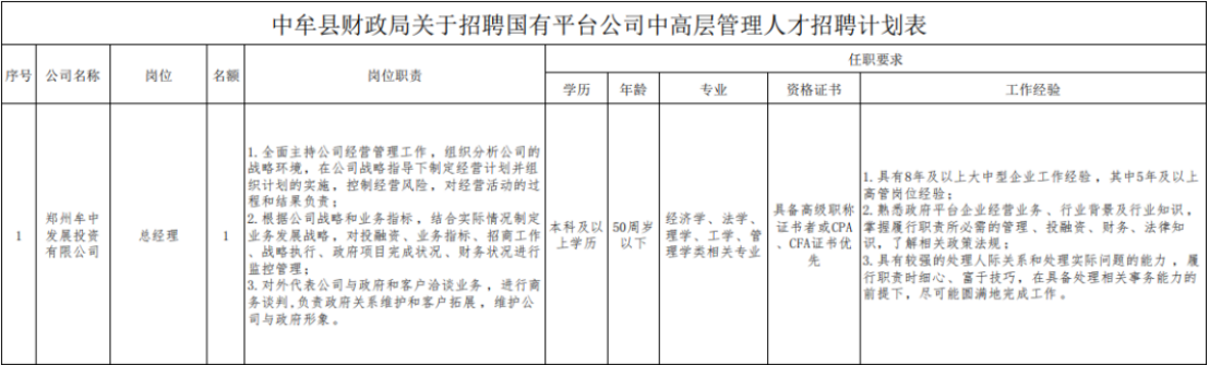本次拟招聘郑州牟中发展投资有限公司、郑州祥中建设开发 有限公司、中牟汇博建设有限公司中高层管理人员共计 12 个岗 位,招聘人员 12 名。上述岗位职责和任职资格详见附件 1:《中牟县财政局关于 招聘国有平台公司中高层管理人才招聘计划表》。