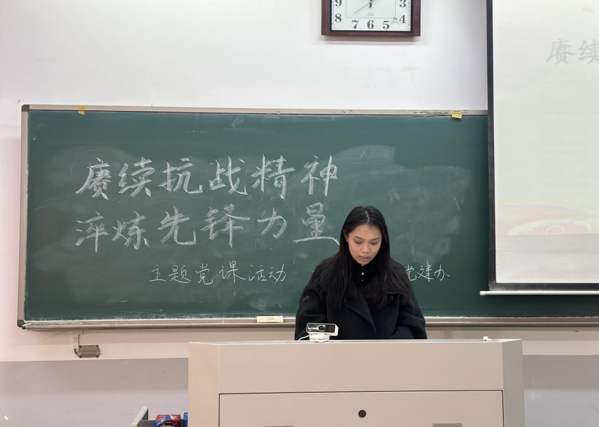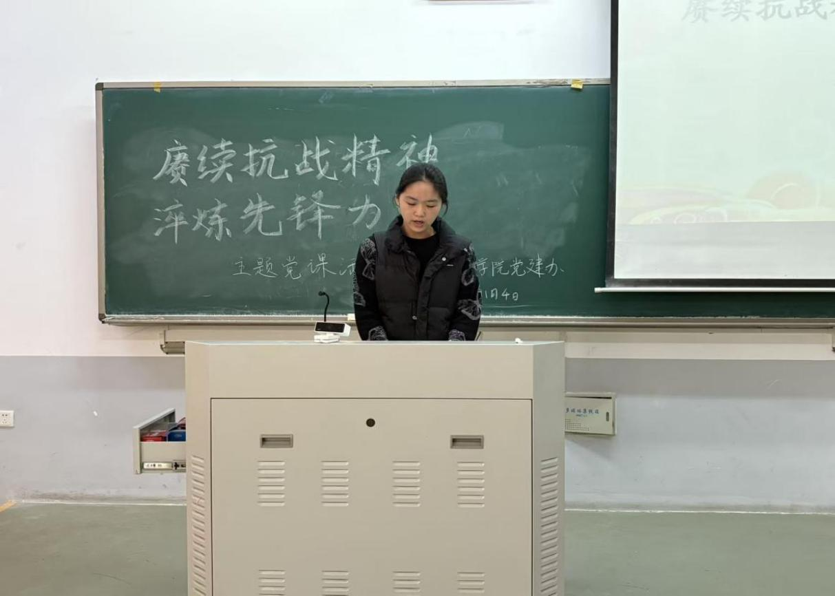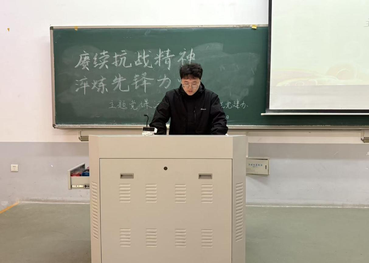此次党课,学生党员王彦滋、申宇和孙潇潇依次进行分享。王彦滋以“抗战精神是新时代先锋标杆的精神密码”为切入点,阐释了抗战精神中“忠诚”与“坚韧”两大核心品质,明确了这些精神财富仍是当代青年应对当下挑战的关键,激励学生党员自觉在政治上、思想上、行动上做到对党忠诚。接着,申宇指出抗战精神是中国共产党人精神谱系中的重要篇章,其蕴含的绝对忠诚的政治品格、舍生取义的责任担当和一心为民的群众立场,至今闪耀着真理光芒。孙潇潇则结合时代要求进行发言,她聚焦习近平新时代中国特色社会主义思想的核心理念要求,阐明了学生党员应用创新理论武装头脑,主动扛起青年时代责任。学生党员们纷纷表示,将以此次活动为契机,深刻领悟抗战精神的时代内涵,在今后学习与生活中,做理论学习的表率、实践锻炼的先锋和道德修养的模范,为社会进步贡献青春力量。